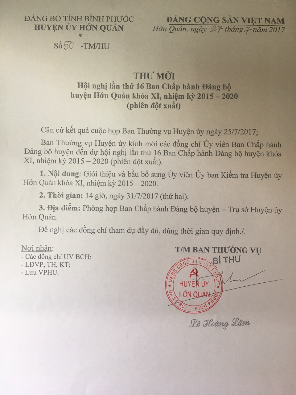 Thư mời Dự hội nghị học tập chuyên đề năm 2017 "Học tập và làm theo tư tưởng, đạo đức, phong cách Hồ Chí Minh về phòng, chống suy thoái tư tưởng chính trị, đạo đức, lối sống, tự diễn biến, tự chuyển hoá" và quán triệt, triển khai các văn bản của Trung ương, Tỉnh uỷ