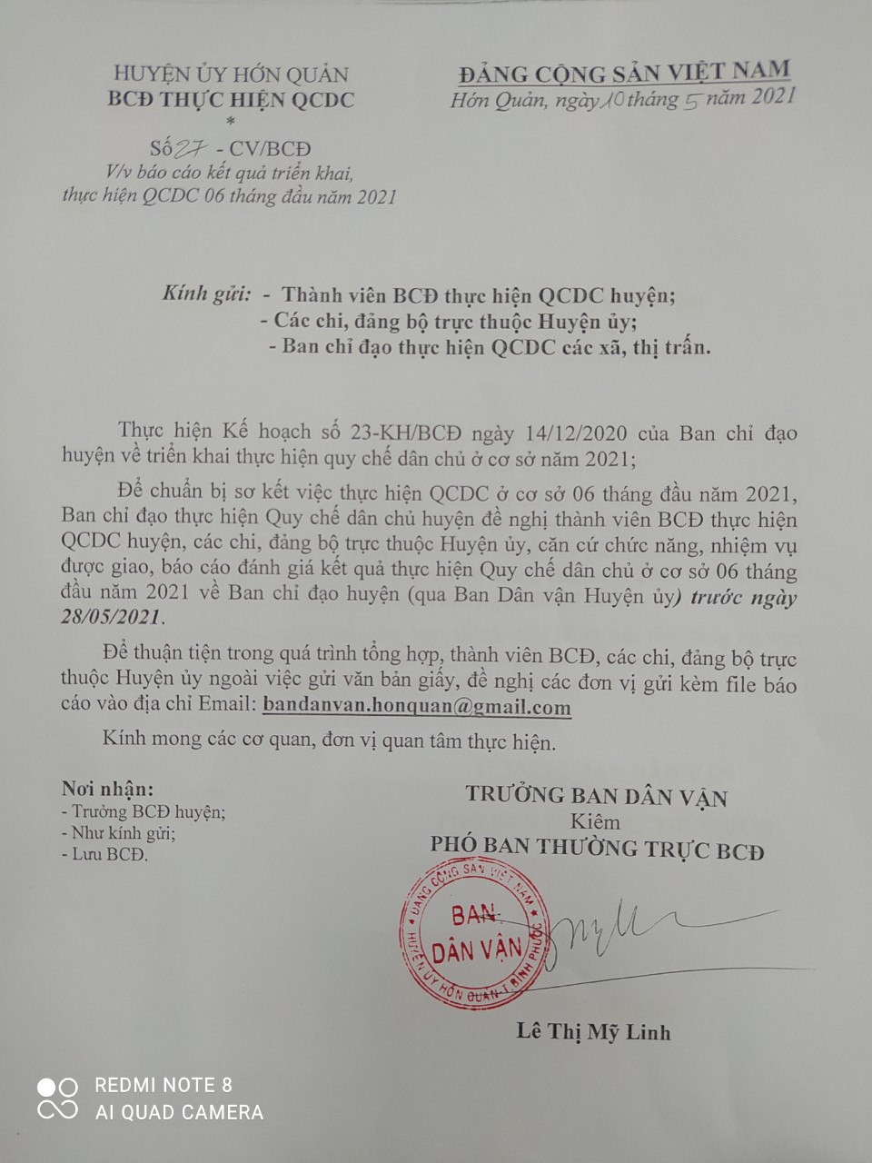| 1 | 27-CV/BCĐ | V/v báo cáo kết quả triển khai thực hiện QCDC 06 tháng đầu năm 2021 |